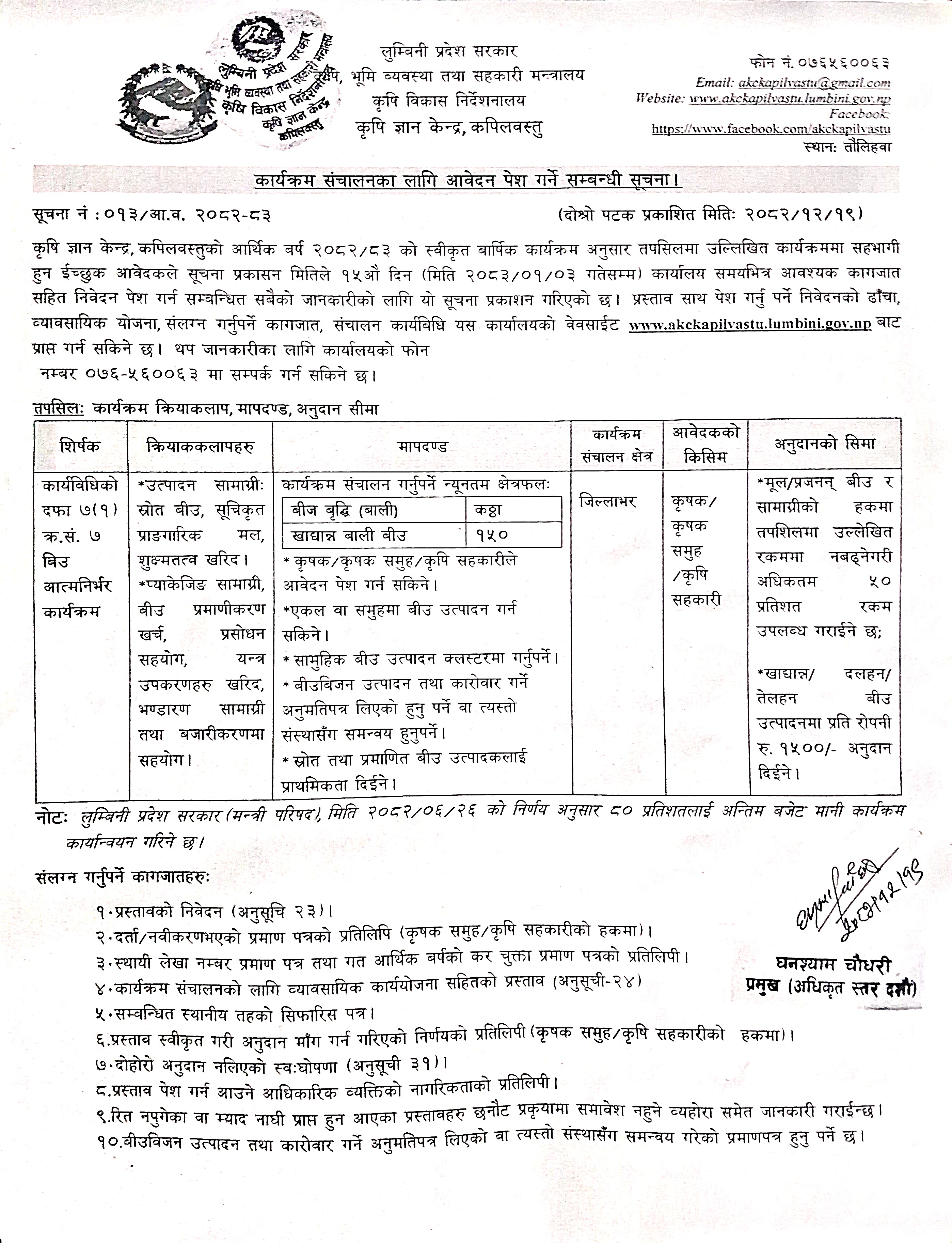 April 2, 2026 बीउ आत्मनिर्भर कार्यक्रम सन्चालनका लागि आवेदन पेश गर्ने समबन्धी सूचना
