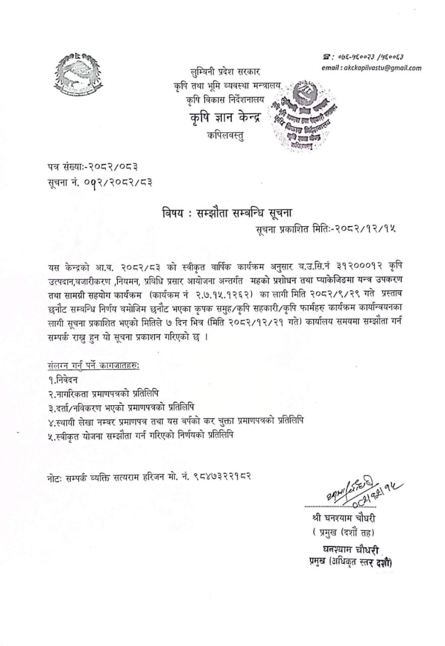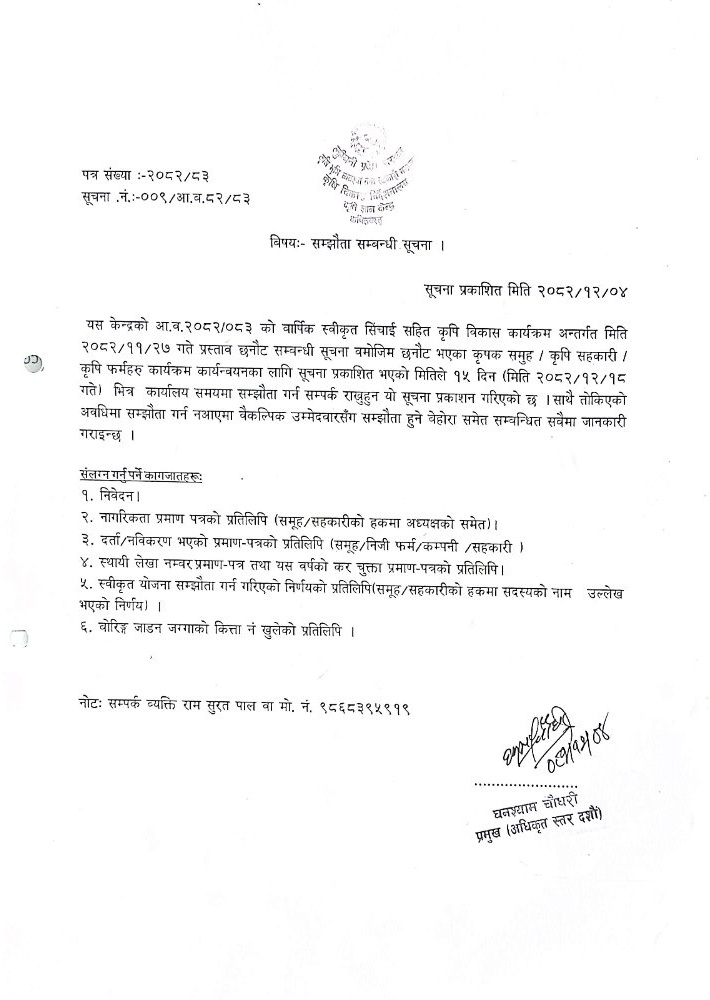 March 18, 2026 सिचाइ सहित कृषि विकास कार्यक्रमको सम्झौता सम्बन्धी सूचना
