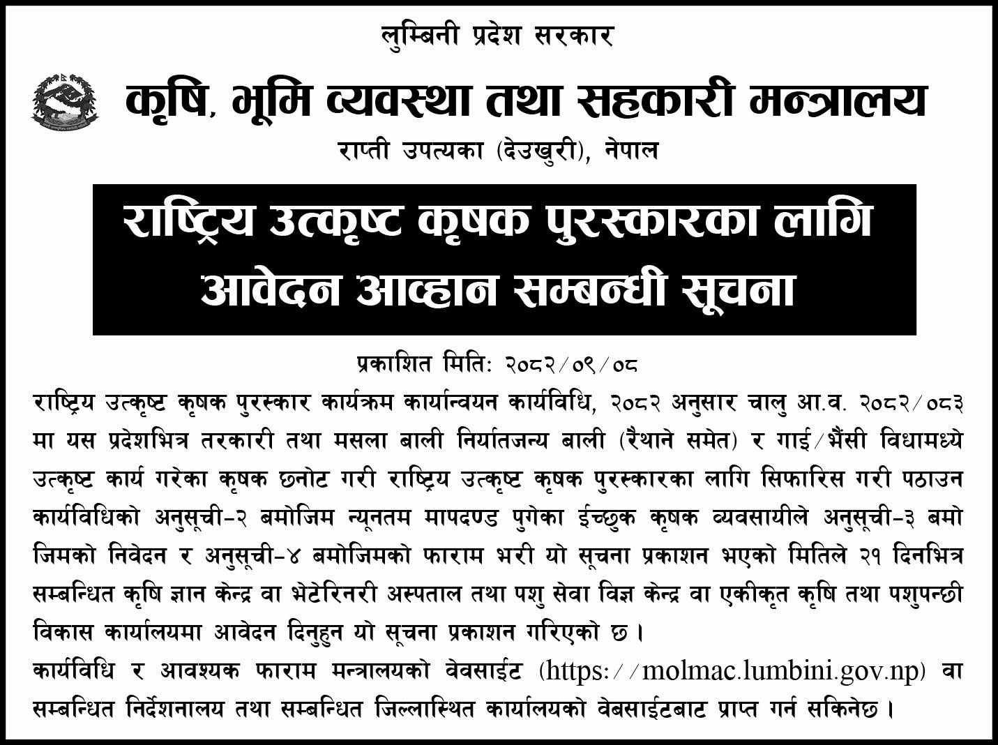 राष्ट्रिय उत्कृष्ट कृषक पुरस्कारका लागि आवेदन आव्हान सम्बन्धी सूचना।